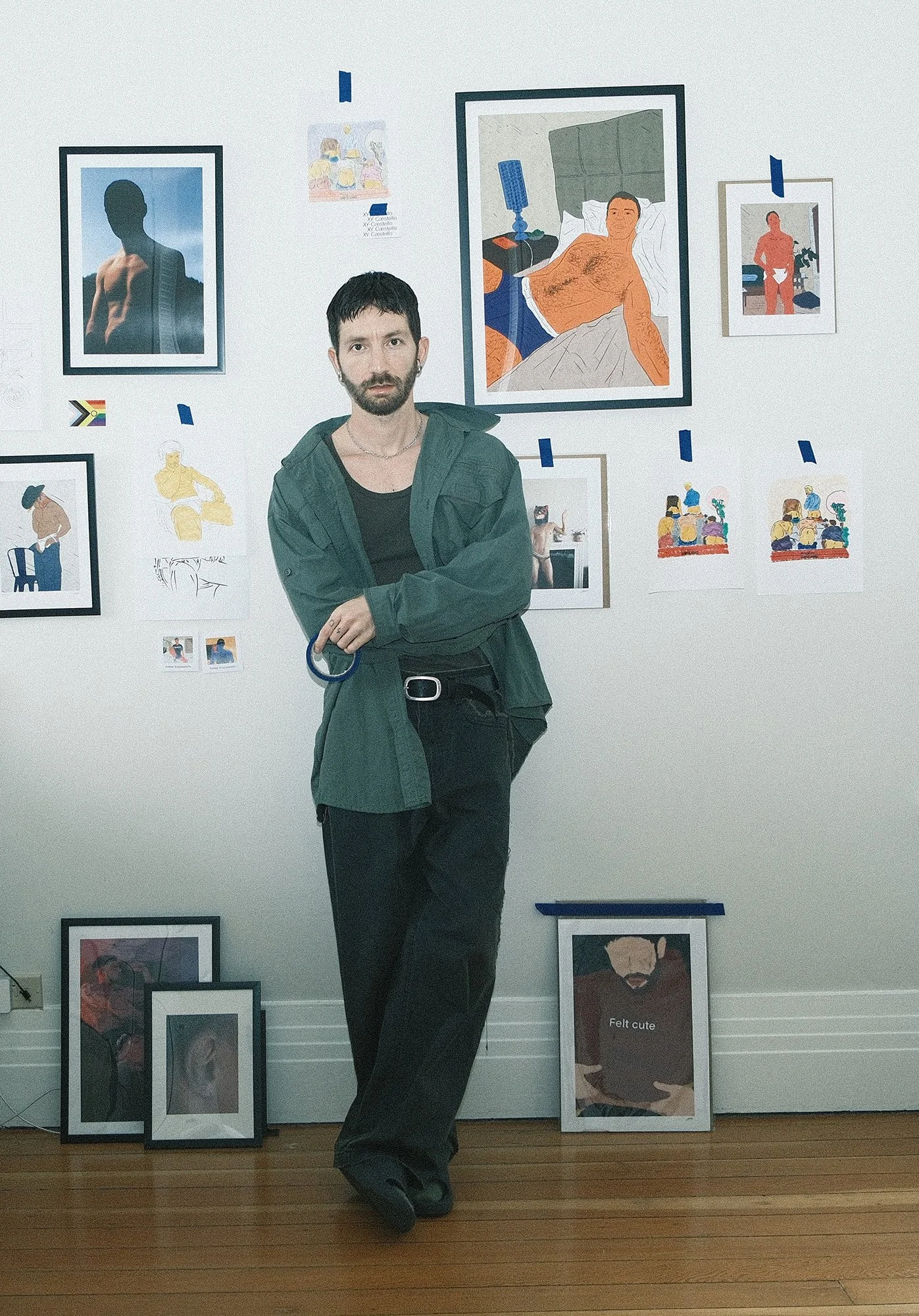His practice moves across photography, drawing, and print, balancing observation and construction. The work is rooted in lived experience, often focusing on queer identity, intimacy, and connection.